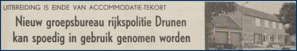 In tegenwoordigheid van de burgemeester van Drunen, mr. H. J. M. Stieger, de burgemeester van Heusden de Edelachtbare, heer A. v. Delft en 'n deputatie van de Rijksgebouwendienst, heeft de districtscommandant van de rijkspolitie, in het bijzijn van de manschappen van de groep Drunen, 't nieuwe politiebureau aan de Prins Bernhardstraat officieel in gebruik genomen. Deze plechtigheid ging niet gepaard met veel officieel vertoon, maar juist daardoor kreeg het gebeuren een zekere intimiteit, die maal al te vaak zoek is bij zo’n dergelijke gebeurtenis. Alleen het weer scheen aan de opening „enige ruchtbaarheid" te willen geven, d.m.v. enkele forse donderslagen.