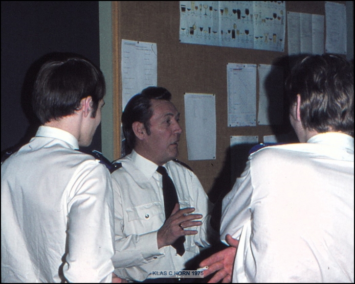 Rechts koffiepauze op de opleidingsschool. Op de voorgrond Piet Mulder. Achter L. ?. M. Bas Mijnster, R. Theo Scholte.