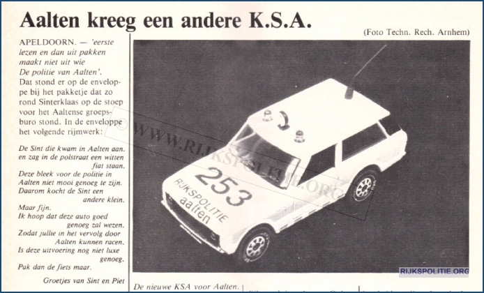 Een KSA was een Kleine Surveillance Auto. En als ik schrijf klein, bedoel ik ook klein. Als ik (2 meter) en mijn collega P. uit Duiven en samen gingen surveilleren in de Fiat 127 stapte hij als eerste in. Hij was meer dan twee meter lang en had schoenmaat 50. Zijn dienstschoenen werden met een speciale goedkeuring van de bedrijfsarts gemaakt. P. perste zich na het sluiten van zijn deur tegen die deur aan. Zodoende kon hij ruimte creëren om mij als passagier ook een plaatsje te gunnen. Hij schakelde op gevoel met zijn hand onder zijn rechterknie, want daar was het versnellingspookje inmiddels verstopt. Aldus Herman van Tilburg