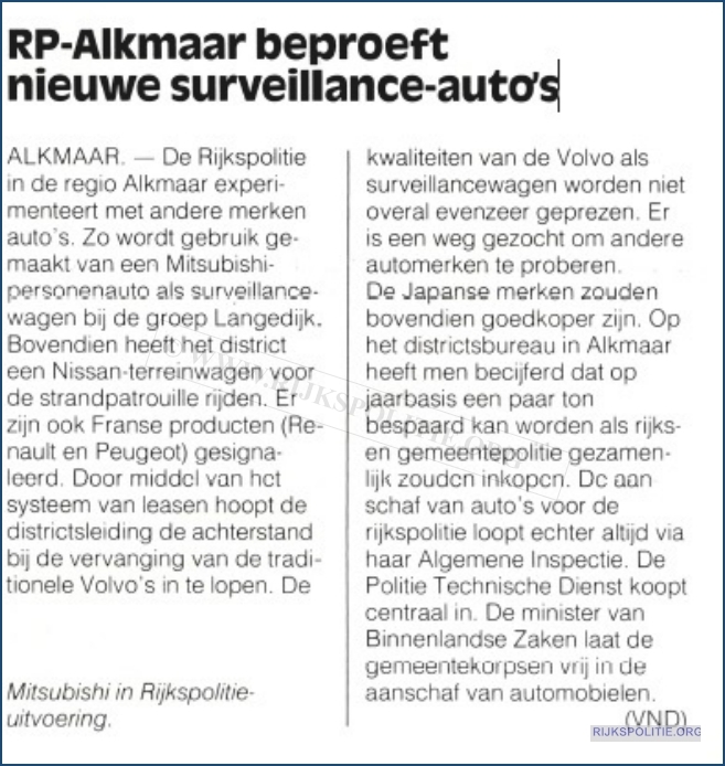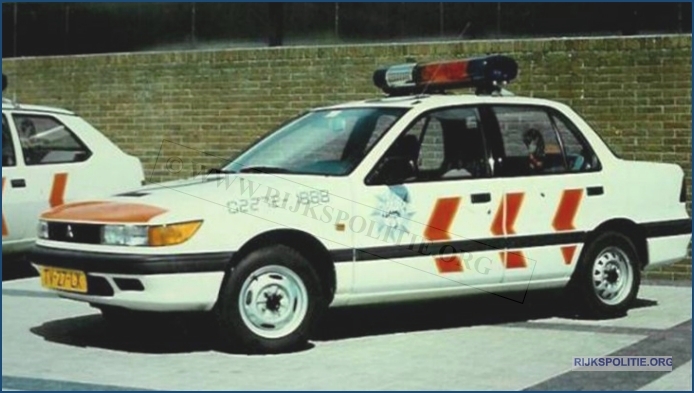 De Mitsubishi Lancer. Van dit type zijn er destijds 10 aangeschaft voor de landgroepen in het district Alkmaar. De Politie Technische Dienst (PTD) in Delft voldeed niet aan haar leveringsplicht. Buiten het contract met de PTD om werden bij een particuliere garage deze auto’s aangeschaft. Na enige tijd werd deze deal ontdekt bij de RP-top in Voorburg. De RP ster moest van de auto’s verwijderd worden en ook mocht er geen rijkspolitie op voor- en achterklep staan. “rijks” werd er afgehaald met gevolg dat de tekst politie asymmetrisch op de voor- en achterkant stond.