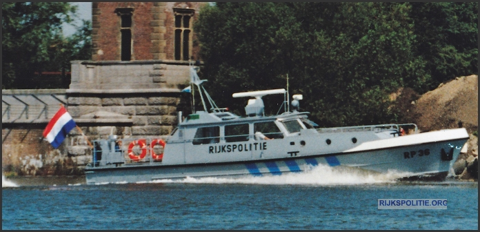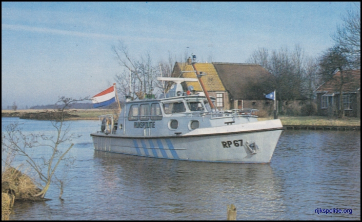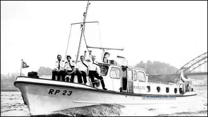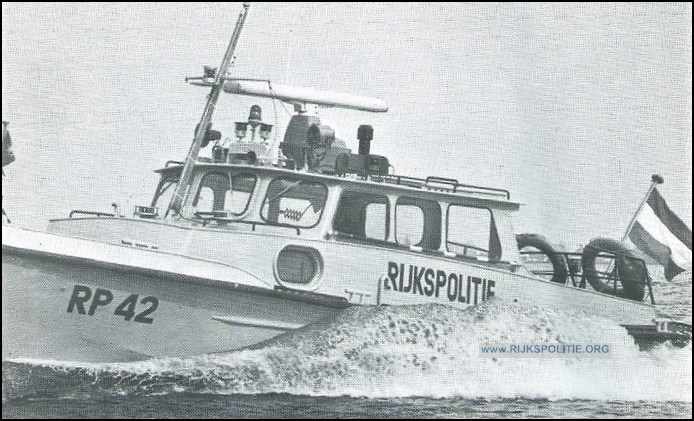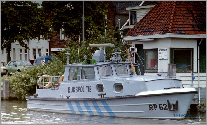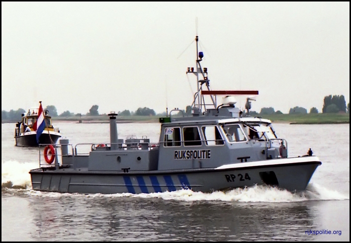 Bootnummers. Begin 1992 worden van veel schepen de bootnummers gewijzigd als gevolg van het inbouwen van nieuwe extra mobilofooninstallaties. De in deze apparatuur gebruikte software kan geen enkele getallen, geen nullen en geen tientallen lezen. Reden om de naamseinen van de RP 1 tot en met de RP 20, de RP 30, RP 40, RP 50, RP 60, en de RP 70 te wijzigen. Eind 1993 worden nogmaals de naamseinen van alle in gebruik zijnde vaartuigen gewijzigd, als gevolg van de grote politiereorganisatie en opheffing van het Korps Rijkspolitie en verdwijnt de R uit het naamsein worden verwijderd.In bovenstaand overzicht is meestal het bootnummer gebruikt dat het langs gebruikt was.