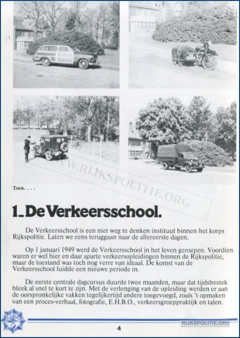In 1979 werd er door de Verkeersschool het boekje "Specialisme Verkeer" uitgegeven over wat de Verkeersschool allemaal te bieden had. Een leuk informatief boekje, dat na al die jaren nu nog leuk is om te lezen en om weer even terug kunnen gaan in die tijd, zeker voor de mensen die ooit een cursus aan de Verkeersschool gevolgd hebben en welke rijkspolitie man/vrouw is daar niet geweest.