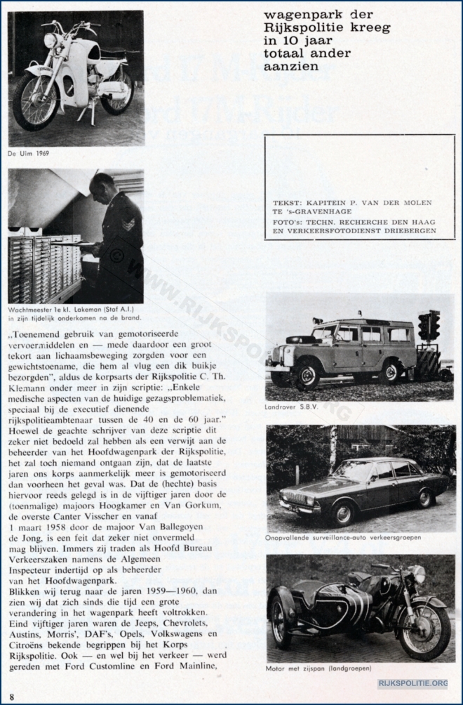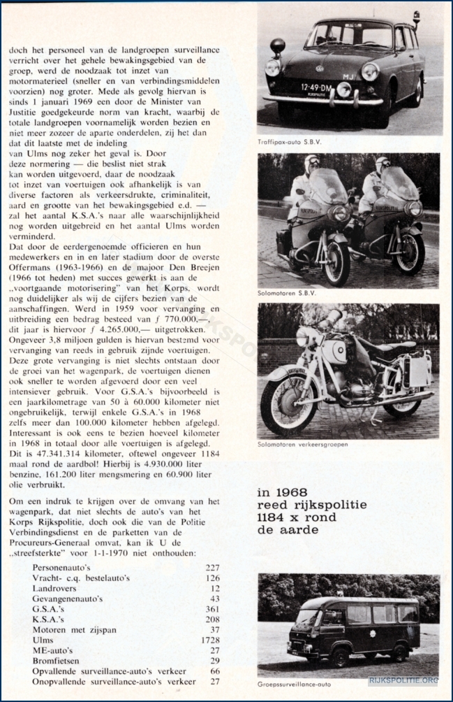Weer enige tijd later kwamen de legerjeeps uit de dump. Deze werden blauw gespoten en voorzien van het opschrift 'RIJKSPOLITIE'. Na een paar jaar kwamen er op alle groepen motoren met zijspan en solomotoren.