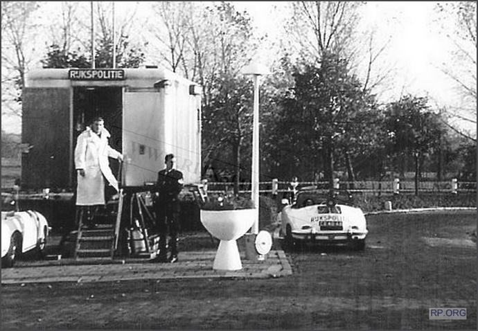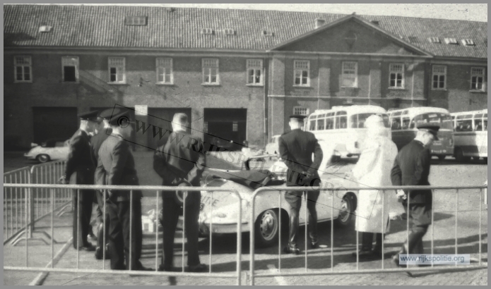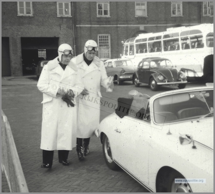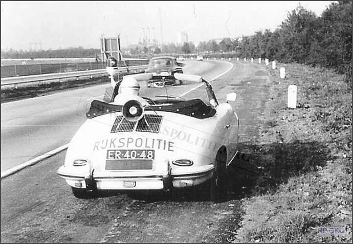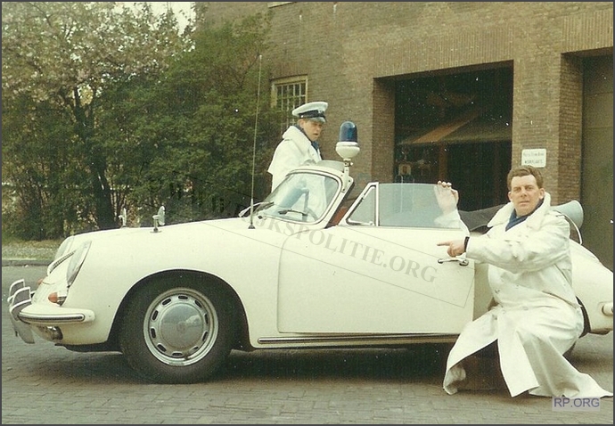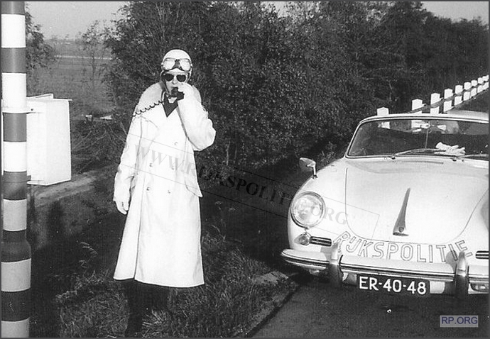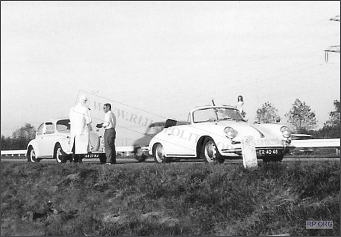 Rinse Hiddinga in gesprek met een aangehouden kever-automobilist. Voorop de Porsche 356C, ER-40-48, Alex 12.12.