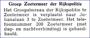 De aankondiging in het Politieblad van de adreswijziging van het groepsbureau i.v.m. een nieuw groepsbureau en een foto van het groepsbureau van het op dat moment (1954) nieuwe bureau aan de Julianalaan 3. In de Politiealmanakken van 1956 t.m.1958 was echter Julianalaan 33 als adres vermeld. Dat zou het adres van de toenmalige groepscommandant Adj. Postma geweest kunnen zijn. Reden hiervoor was dat hij de dienstpost op zijn huisadres wilde hebben bezorgd. Iets wat in die tijd wel vaker gebruikelijk was bij kleine groepen en die ook nog geen administrateur hadden. Daarom werd het woonadres van de Groepscommandant vermeld en niet het adres van het groepsbureau. Soms werden beiden adressen vermeld hetgeen natuurlijk wel duidelijker was.